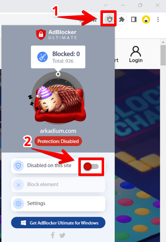 AdBlocker Ultimate: Öffnen Sie die Arkadium-Webseite im Browser, klicken Sie auf das AdBlocker Ultimate (1)-Symbol und deaktivieren Sie den Schalter (2) neben der Option "Auf dieser Site aktiviert". Laden Sie den Browser neu.