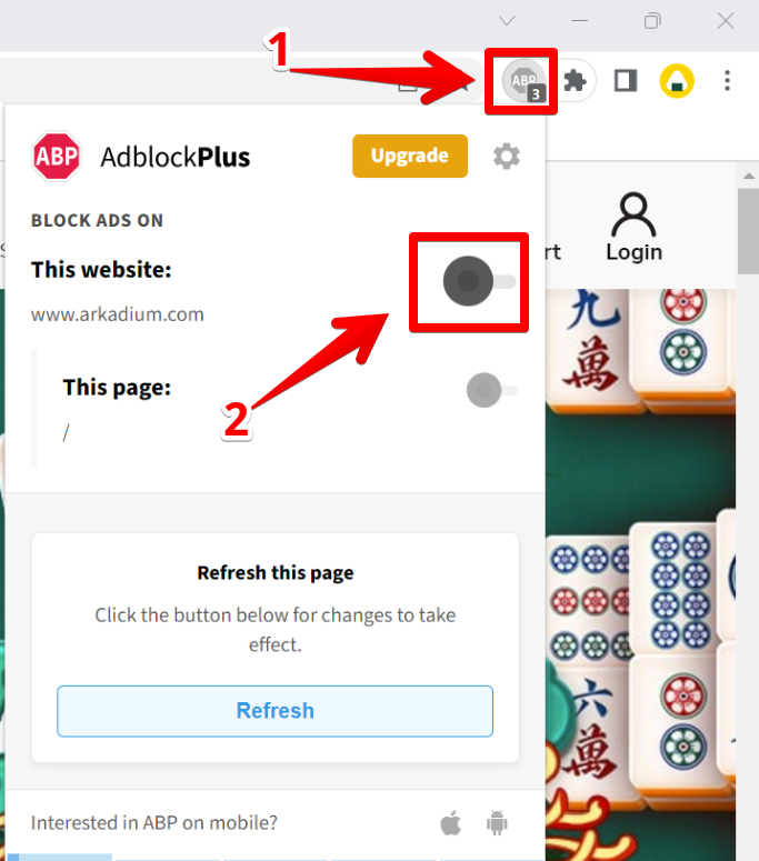 Adblock Plus: open the Arkadium website in the web browser, click the Adblock Plus (1) icon, and disable the Toggle (2) next to the “This website” option. Reload the browser.
