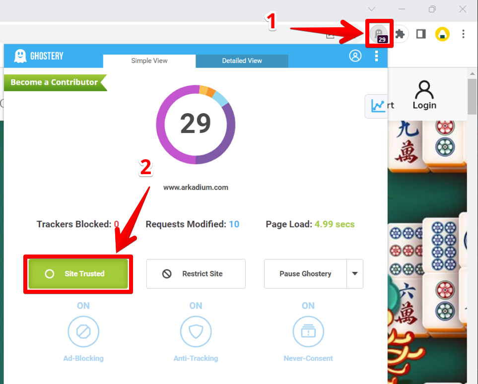 Ghostery: open the Arkadium website in the web browser, click the Ghostery (1) icon, and click the Trust site (2) button. Reload the browser.