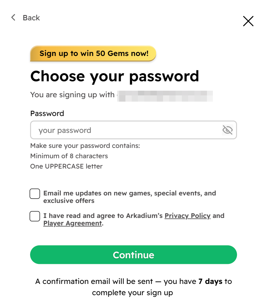 3. If you've entered with your e-mail instead of your Google or Facebook profiles, you'll have to set up a password. Insert it according to the rules and place a checkmark on whether you'd like to be e-mailed updates on new games, special events and exclusive offers, and on having read Arkadium's Privacy Policy and Player Agreement. This second one needs to be checked in order for you to continue.