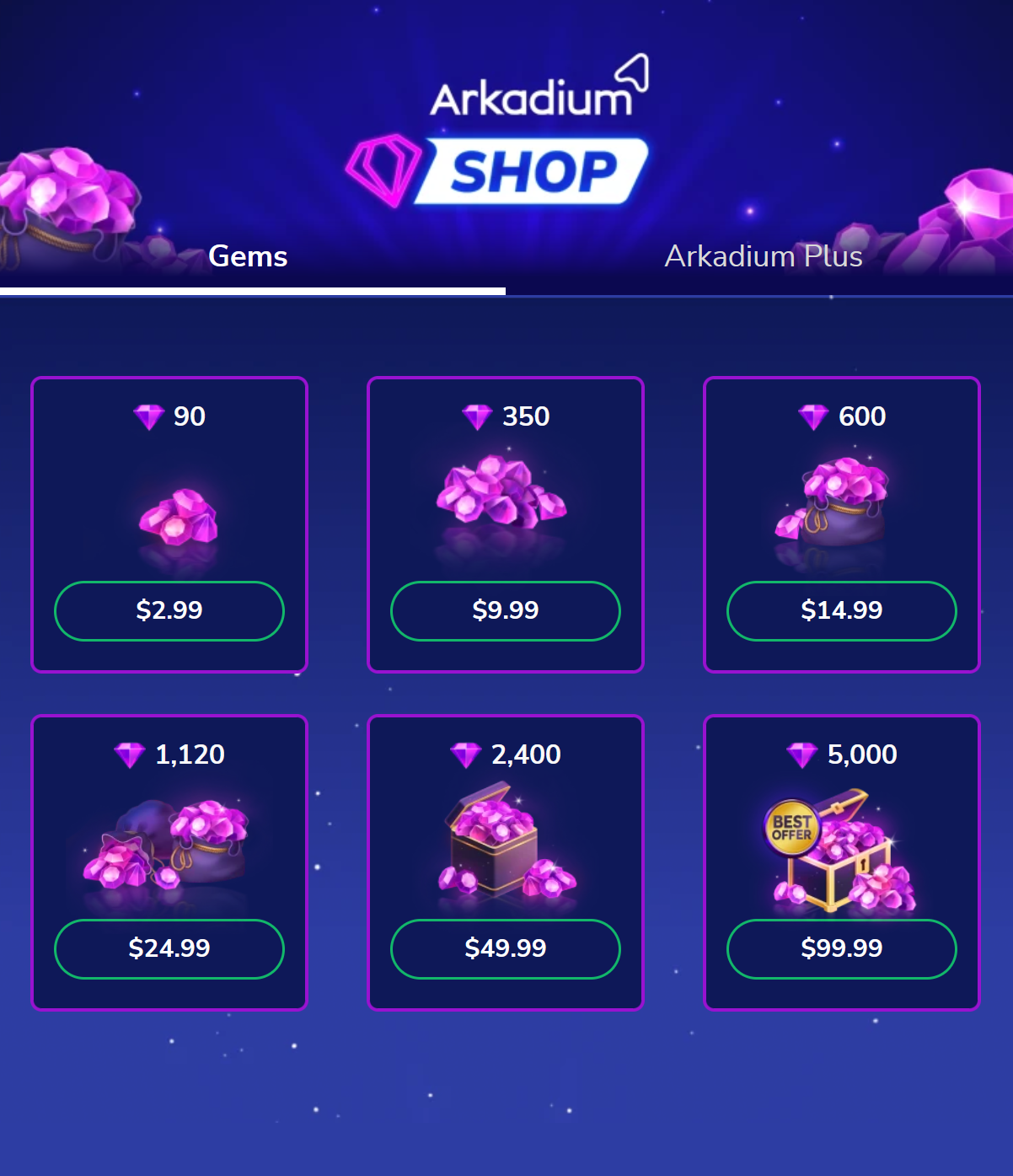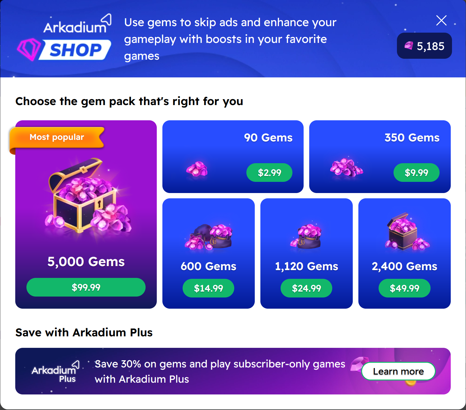If you'd like to remove ads altogether, subscribe to Arkadium Plus. Subscribers not only enjoy ad-free gameplay, but they also automatically save 30% on every gem purchase.