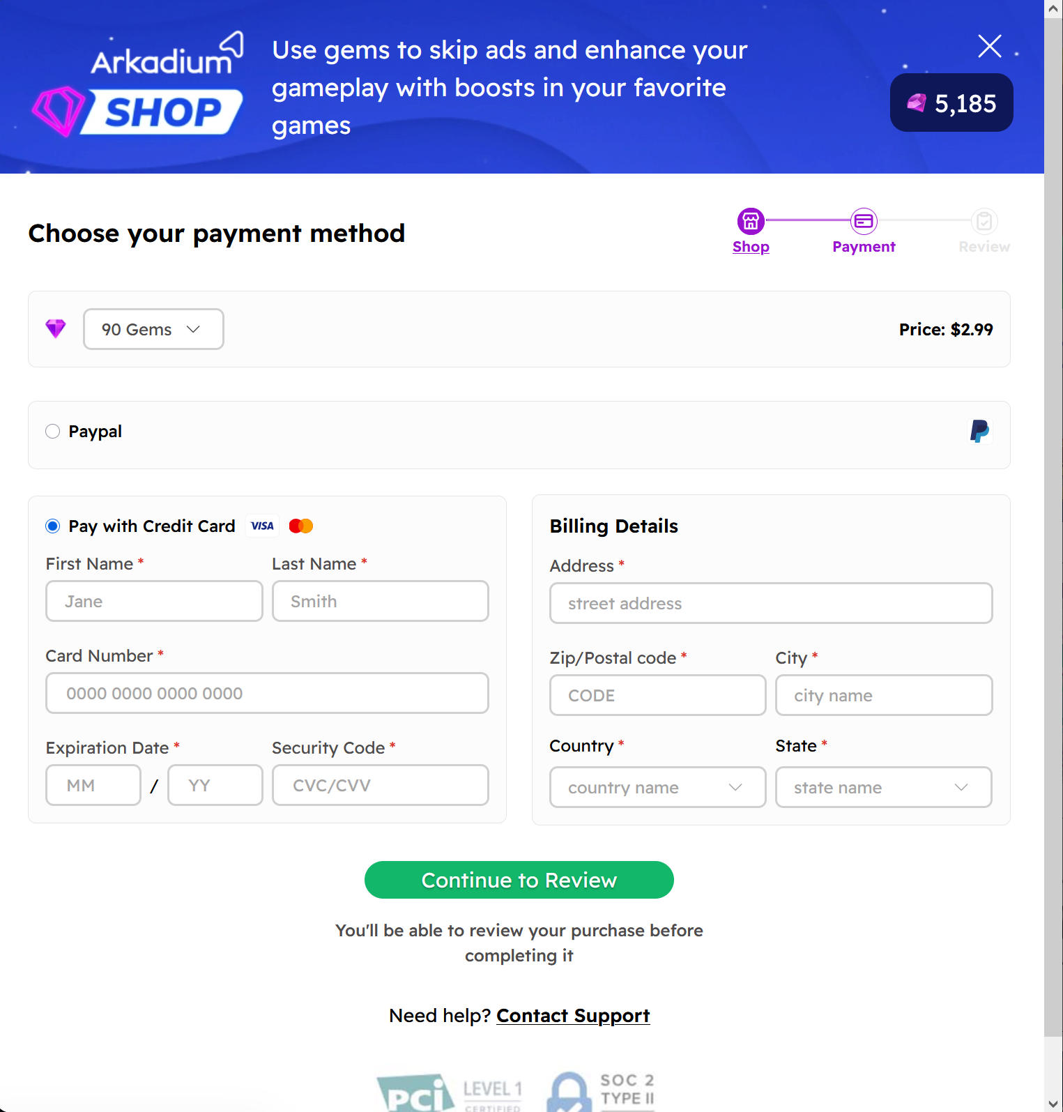 After clicking on the amount of Gems you want to purchase, you'll be taken to the payment platform, where you'll be able to insert your payment details and purchase the Gem package.