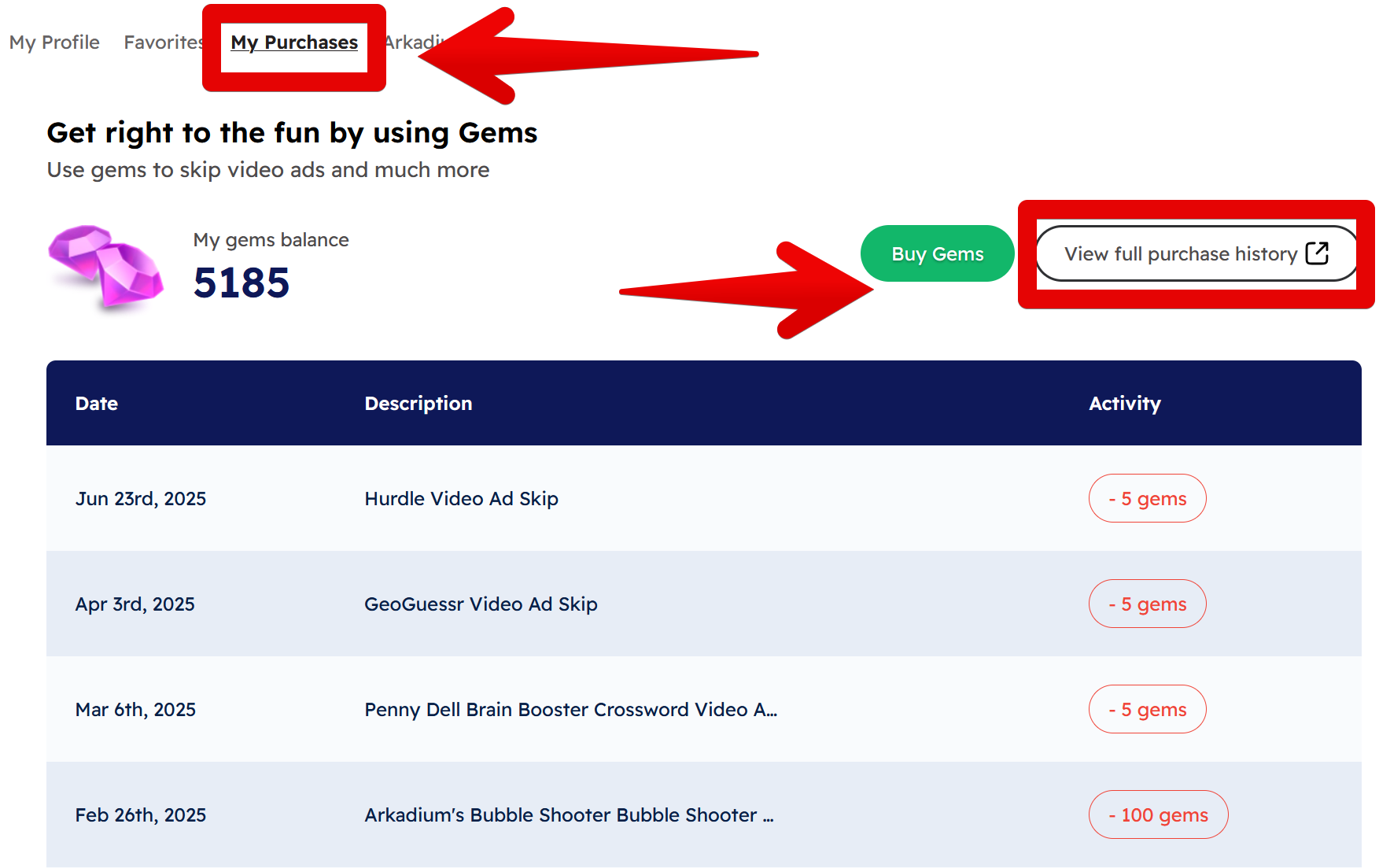 You can then click on where it says My Purchases to be taken to your Gem transactions, and click on View Full Purchase History to be taken to the Gems section of your account payments.