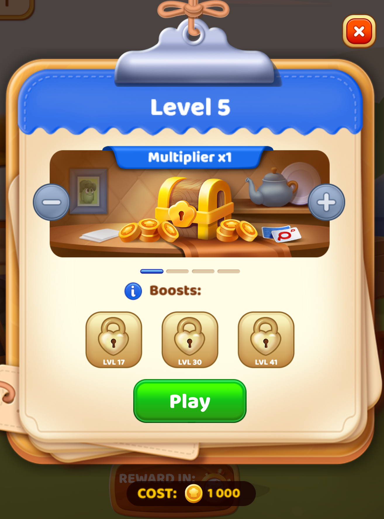 - Next level. Click here to access the next level of the game. You can select the level of the game through the plus and minus buttons, and select the boosts you'd like to use. There is a cost to entering a level, as shown below.