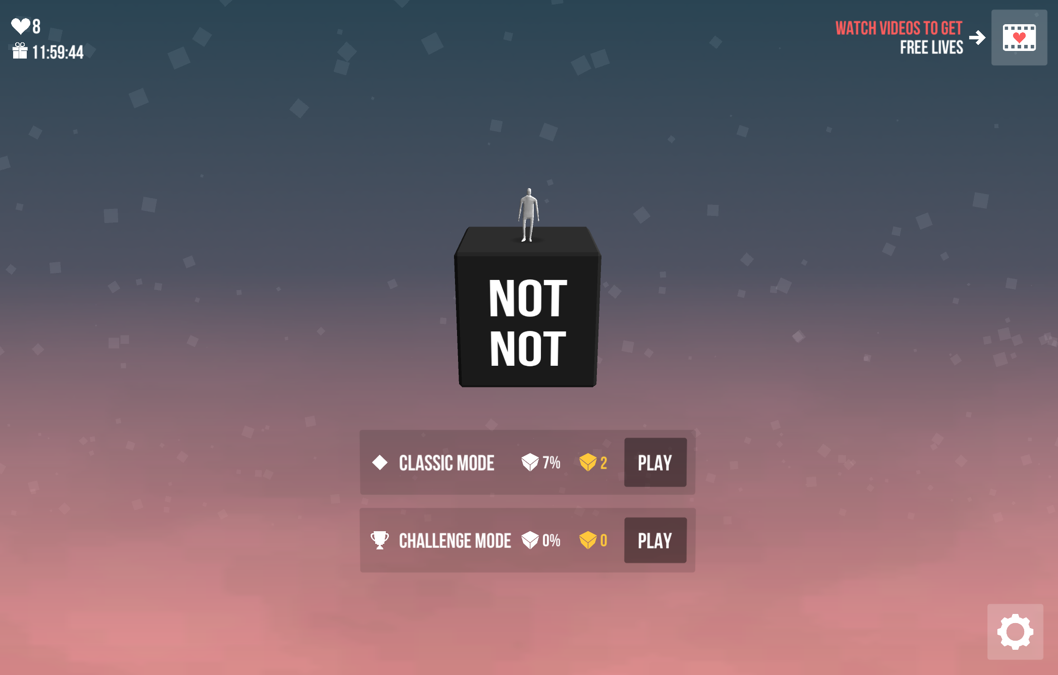 The game begins in the main menu. You have 8 lives to use, shown on the top left, with a timer ticking down to when more will be given to you. You can also watch videos to get free lives on the top right, while the Options menu is on the bottom right.