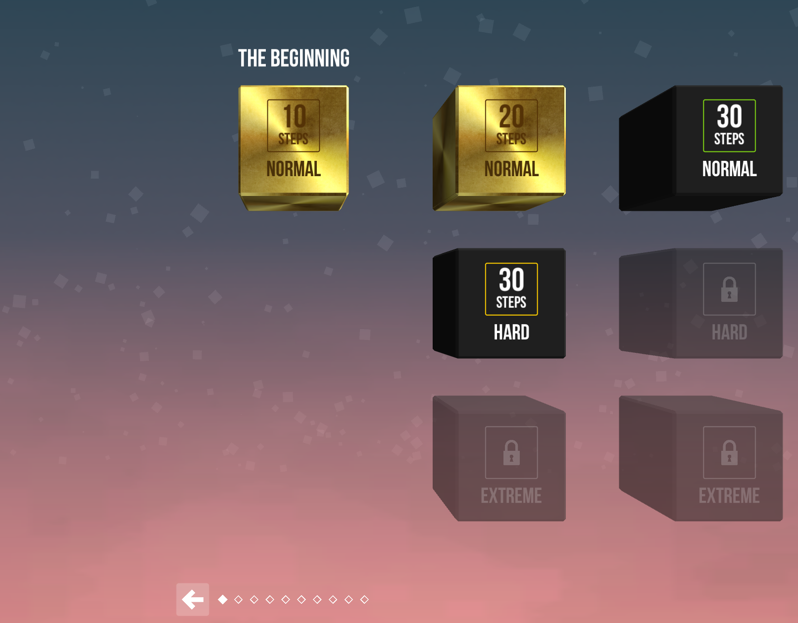 Selecting Classic Mode will give you a number of different levels to clear. Cleared levels will be shown in gold. Available levels, in black. And levels you've yet to unlock, will be shown with a lock icon. Each level has a difficulty set and a number of steps to complete.