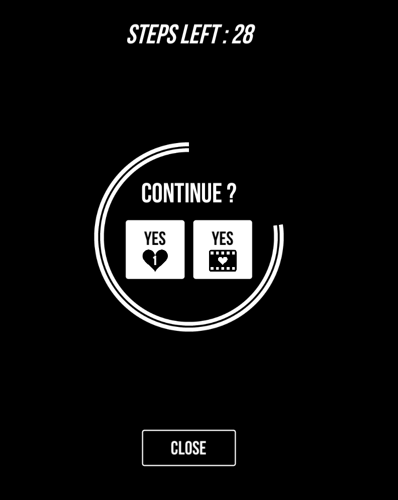 Should you lose, you'll lose a life. You can prevent this by clicking to watch an ad on the right option. Pick the left option to continue by using a life. Pick the "Close" option to exit.