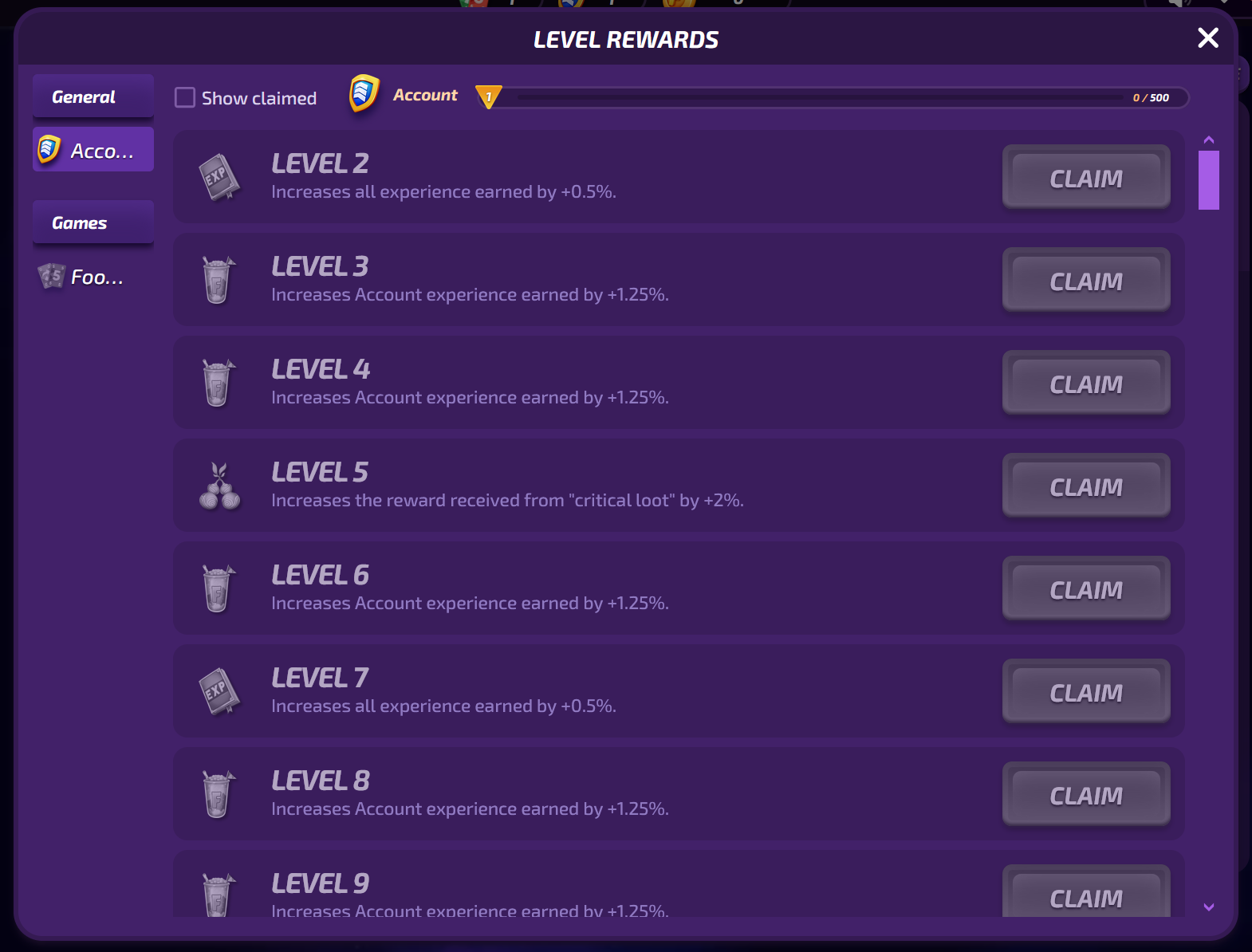 Your game level increases as you play more games. Clicking on it will take you to the level rewards page, where you can claim rewards as you gain more levels.