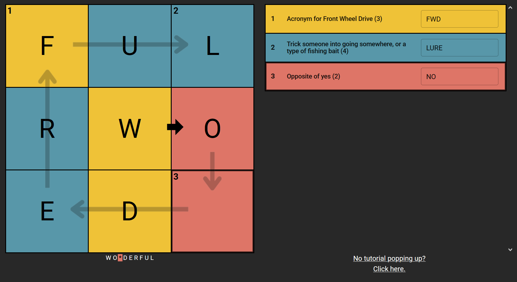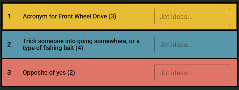 On the right, you'll see clues for the three different words in the puzzle. Each clue will have the number of letters in each word alongside it. You can type your ideas for what they might be in the "Jot Ideas" section. As an example, the first clue is "FWD".