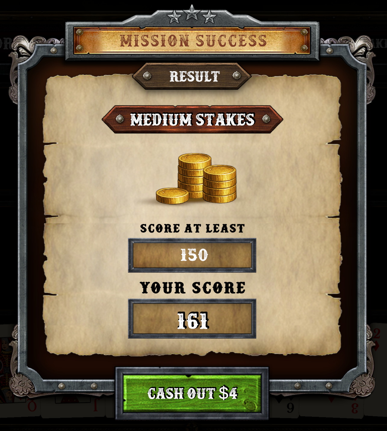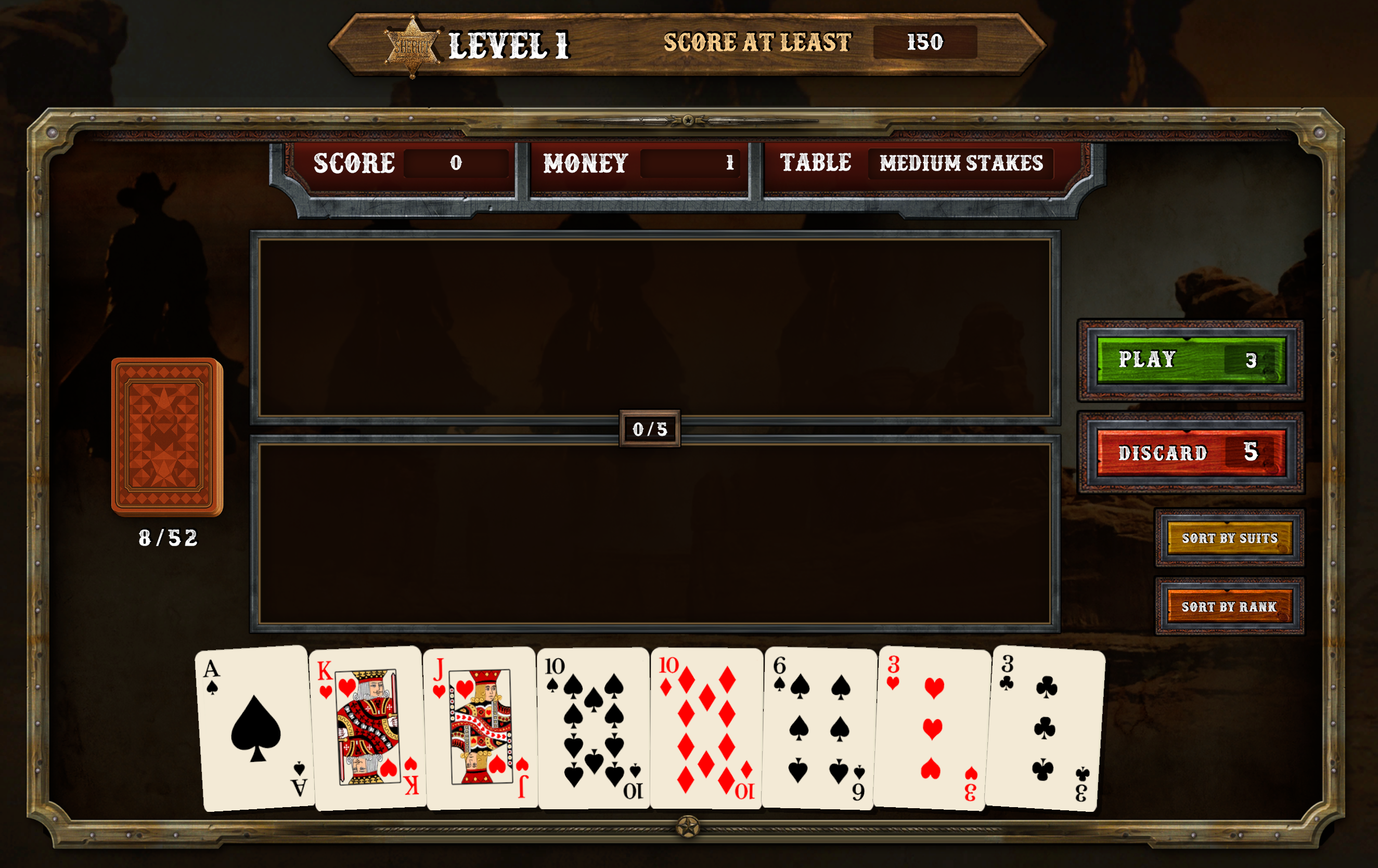 Saloon Showdown has no scoring system. This game is meant to be a fun roguelike Poker game to play on successive runs, without a specific scoring system or leaderboard. The game is incompatible with the regular competitive Arkadium leaderboards, and it's meant for a fun ongoing challenge.