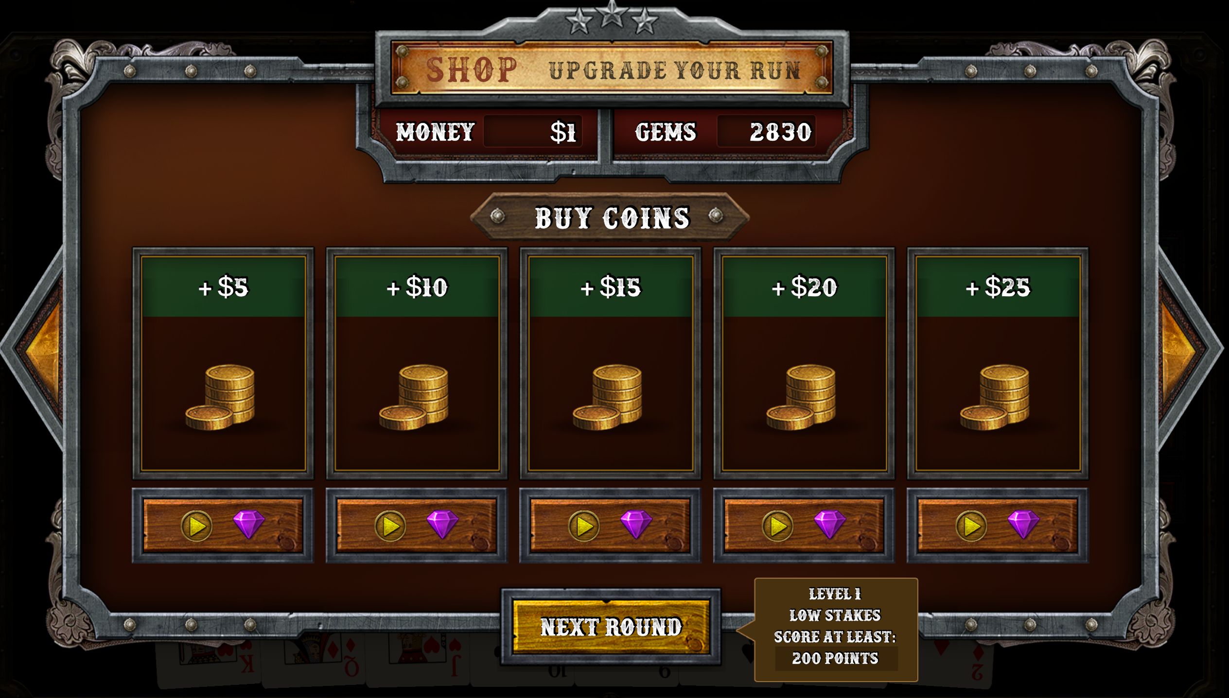 You'll be able to see your score, money, and the stakes the table you're on plays by. Higher stakes will mean higher earnings but higher losses. Each table has low, medium and high stakes to get through.