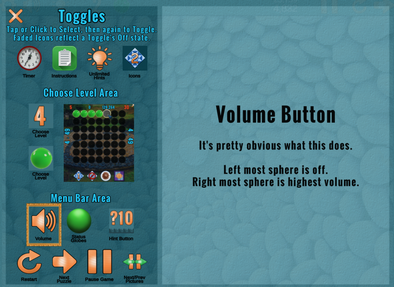 The settings menu shows an explanation of each of the game's elements. You can toggle different game elements on top by clicking on them, or check an explanation of the entire game's menu icons and the way to receive hints. You can add time to the timer, turn the instructions on or off, and even toggle how many hints you want to receive per level.
